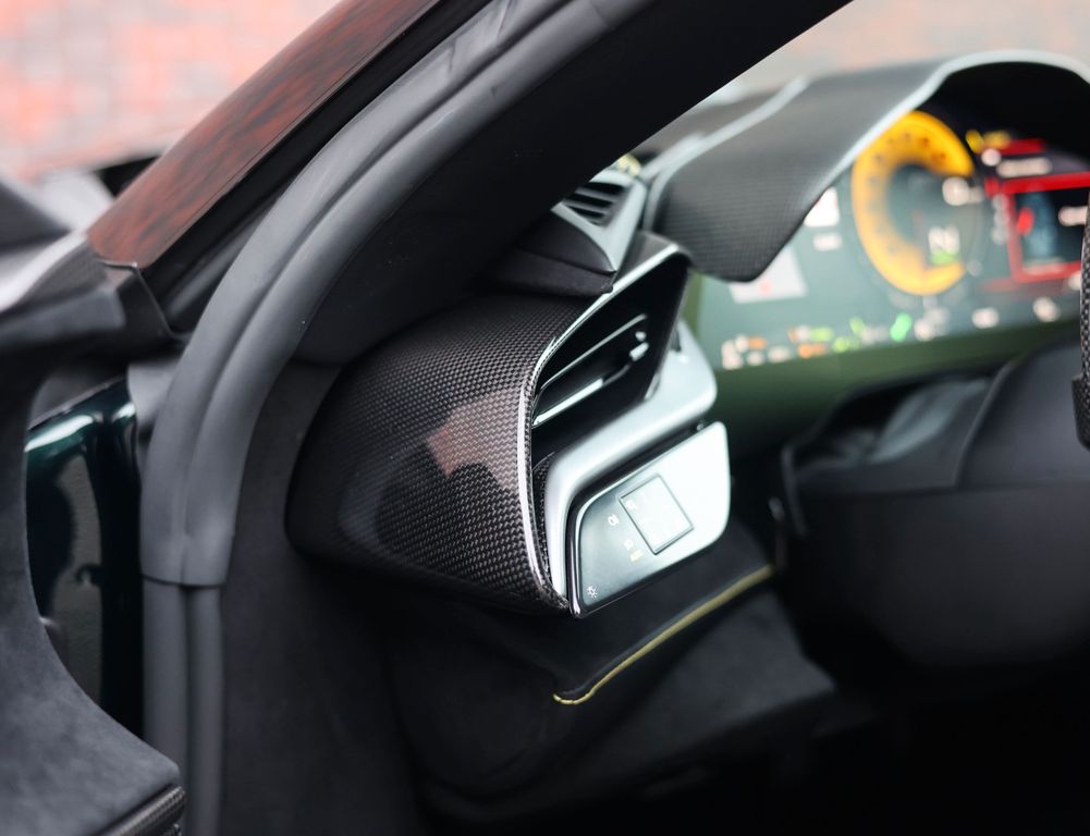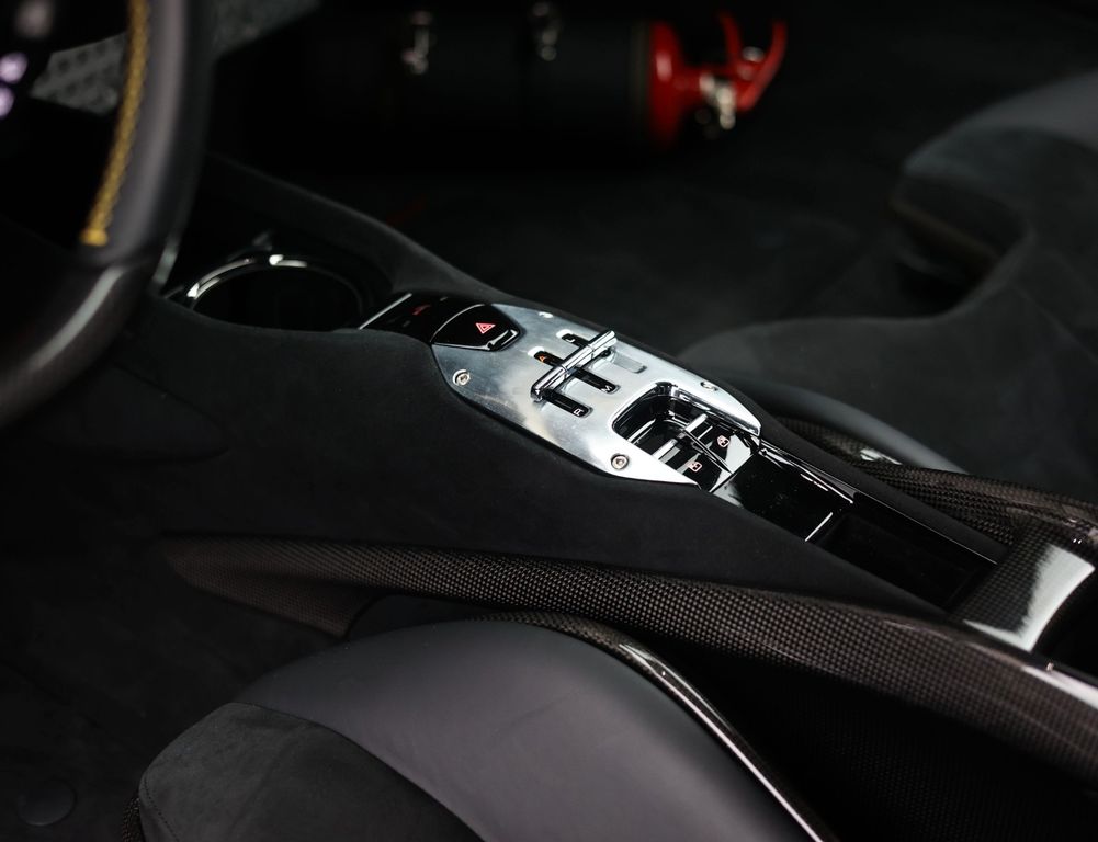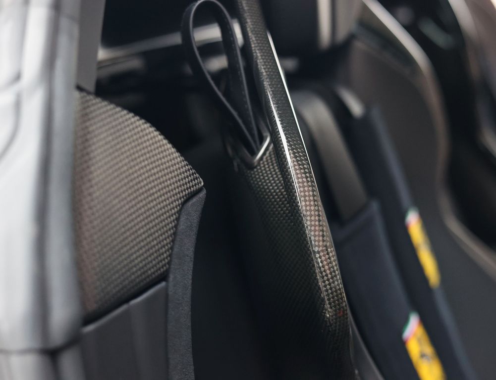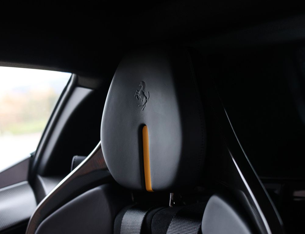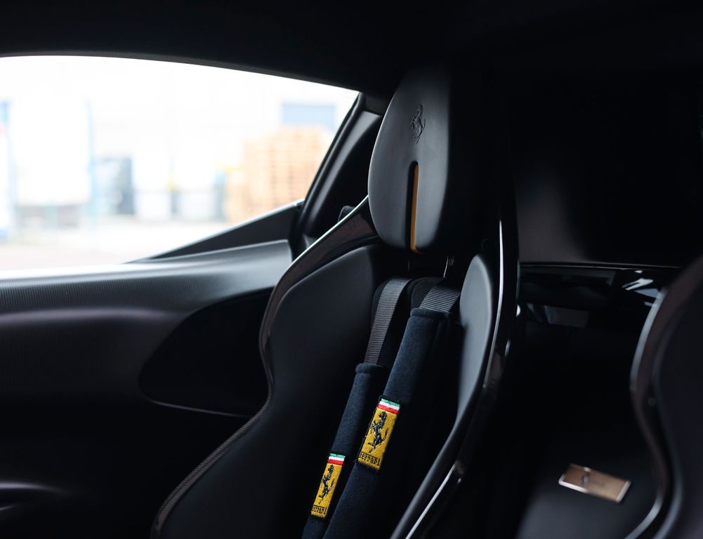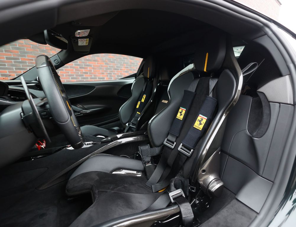 Inside, the contrast between luxury and motorsport is just as compelling. The Alcantara Nero interior with carbon racing seats, carbon driver zone and carbon dashboard inserts radiates competition, while the coloured stitching and Giallo details subtly reference Ferrari’s racing DNA. The extensive Alcantara trim and 4-point harnesses make it clear that this is no standard SF90, but a car configured with intent, for the driver who values pure experience above all else.