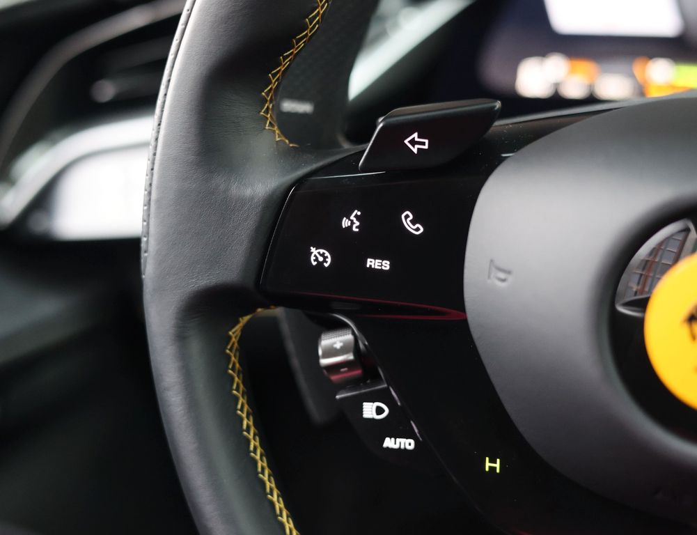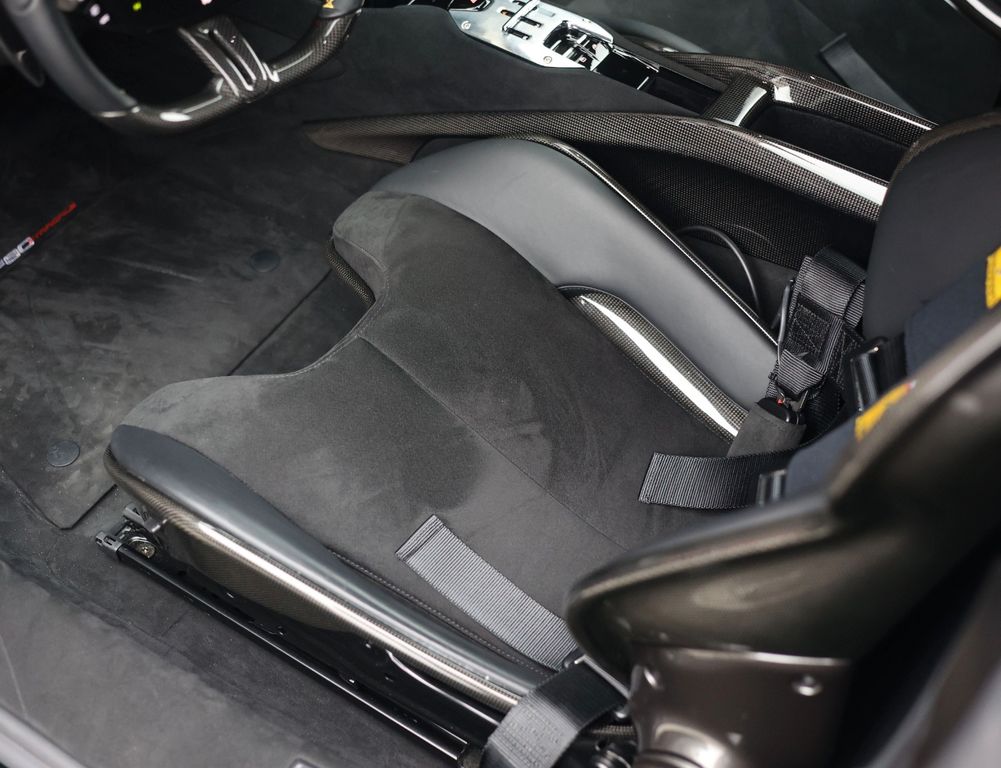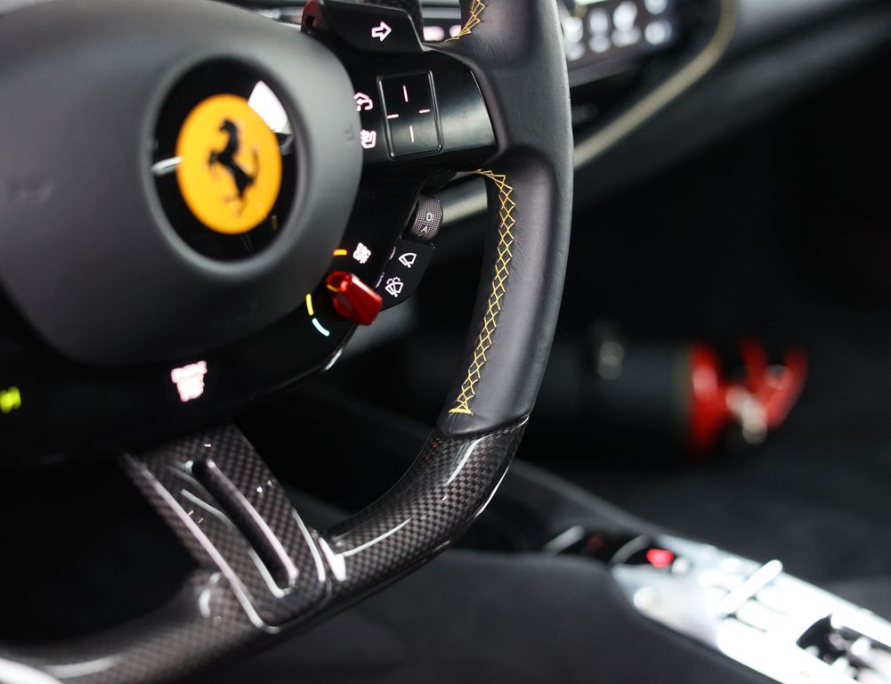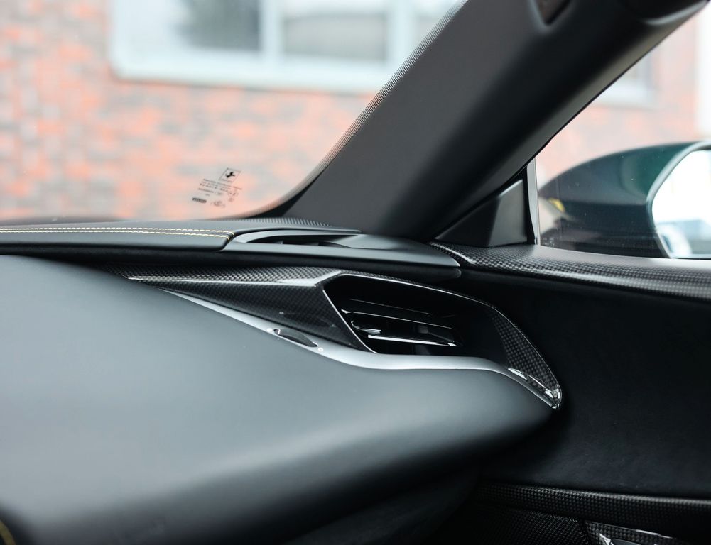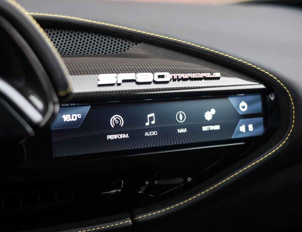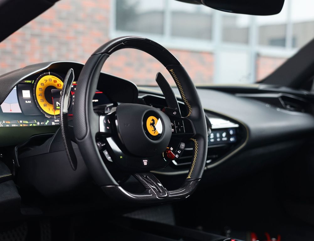Inside, the contrast between luxury and motorsport is just as compelling. The Alcantara Nero interior with carbon racing seats, carbon driver zone and carbon dashboard inserts radiates competition, while the coloured stitching and Giallo details subtly reference Ferrari’s racing DNA. The extensive Alcantara trim and 4-point harnesses make it clear that this is no standard SF90, but a car configured with intent, for the driver who values pure experience above all else.