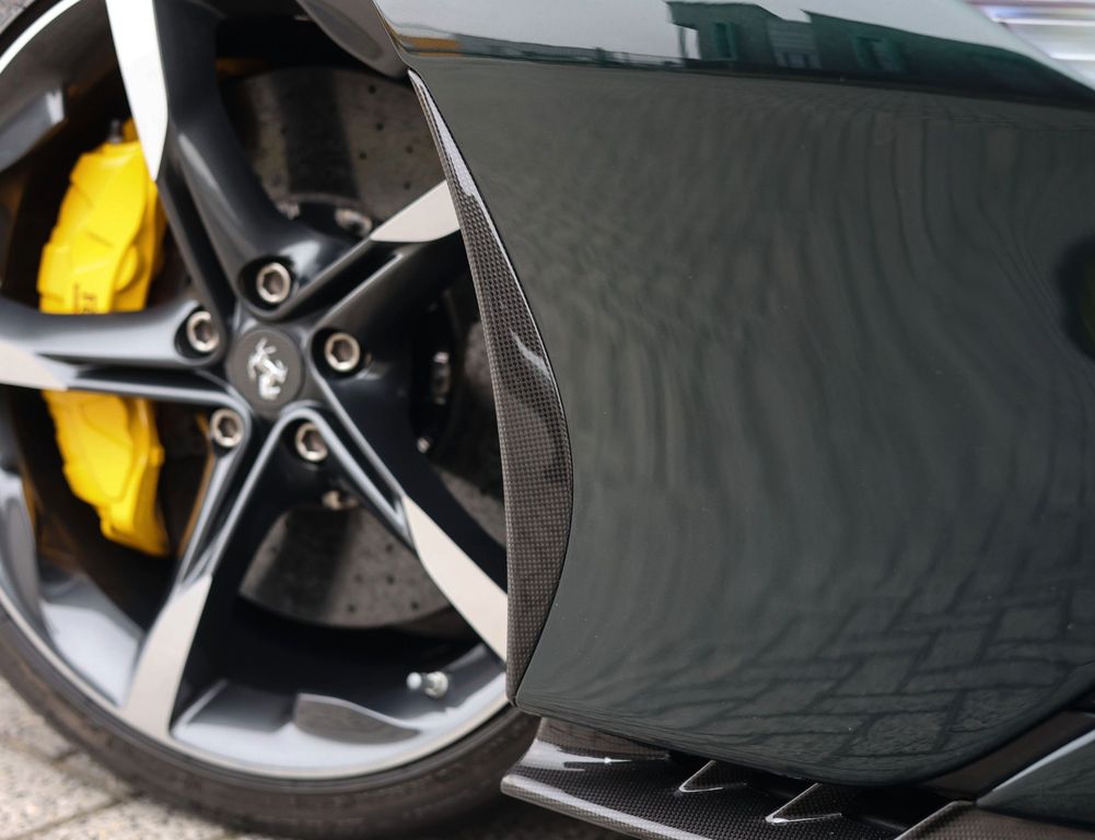 The exterior is finished in Verde Zeltweg metallic, a deep and elegant green with a subtle metallic sheen. Combined with the two-tone Nero bodywork details and the Giallo Modena striping, the result is a composition that is both refined and expressive. The Extended Assetto Fiorano package transforms this elegant base into a no-compromise driver’s car, with a carbon front spoiler, side air splitters, rear diffuser and underhood cover that are not only visually striking, but also deliver real downforce and circuit stability. The forged Diamond wheels with titanium wheel bolts and yellow brake calipers reinforce the motorsport character without sacrificing exclusivity.