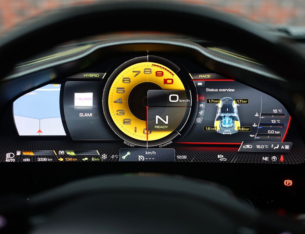 The powertrain needs little introduction. The 4.0-litre twin-turbo V8, supported by three electric motors, delivers a staggering 1,000 hp. Acceleration is nothing short of brutal; the way the SF90 builds speed feels almost unreal, comparable only to a jet aircraft. The Assetto Fiorano package sharpens this character even further with a more focused set-up, reduced weight and a more direct connection between car and driver. This is not a hybrid for efficiency, this is electrification as a performance amplifier in its most extreme form.