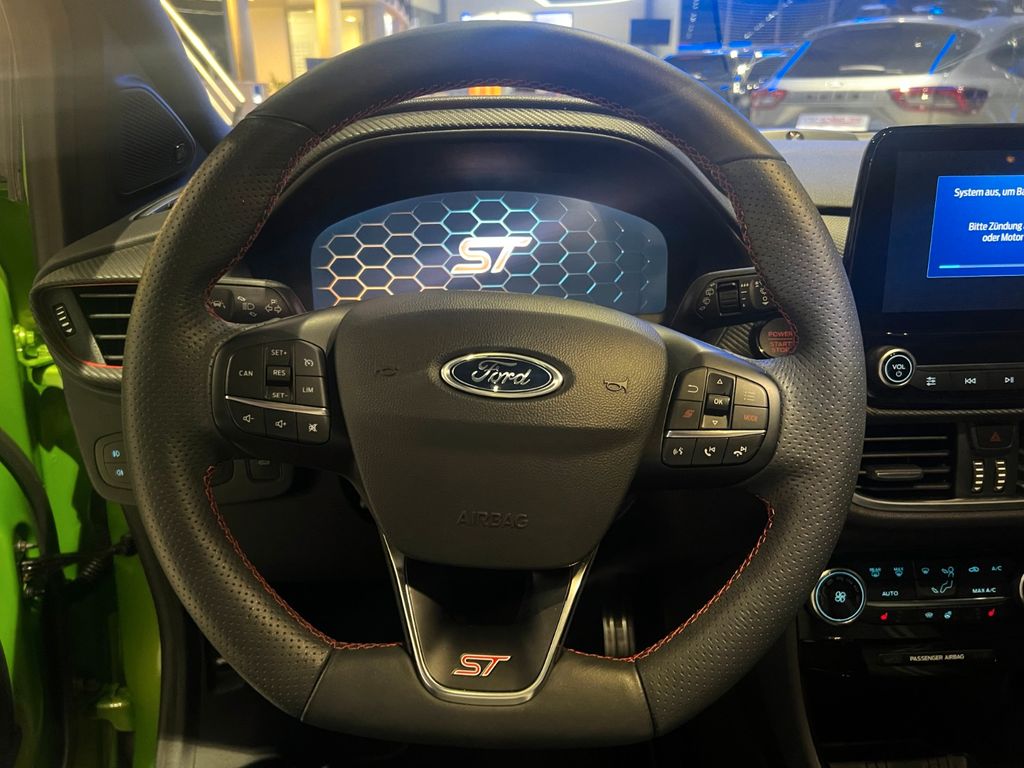 Ambiente-Beleuchtung vorn (LED), Antischlupfregelung (ASR), Audio-Navigationssystem Ford mit AppLink, Außenspiegel elektr. anklappbar, Außenspiegel elektr. verstell- und heizbar, Bi-LED-Scheinwerfer, Body-Styling-Paket, Bremssättel Rot lackiert, Dach andersfarbig lackiert / Kontrastfarbe, Dachhimmel Stoff, dunkel, Dachspoiler (große Ausführung) schwarz lackiert, Doppelendrohr Auspuffanlage, Eco-Anzeige für verbrauchsoptimiertes Fahren (EcoCoach), Einparkhilfe hinten, Fahrassistenz-System: Berganfahr-Assistent (Hill-Holder), Fahrassistenz-System: Falschfahrer-Warnfunktion, Fahrassistenz-System: Fernlichtassistent (Scheinwerfer mit Abblendautomatik), Fahrassistenz-System: Notbrems-Assistent, Fahrassistenz-System: Post-Collision-System, Fahrassistenz-System: Pre-Collision-System, Fahrassistenz-System: Spurhalteassistent mit Müdigkeitserkennungs-Sensor, Fahrassistenz-System: Verkehrsschildassistent, Farbdisplay für Bordcomputer, Fensterheber elektrisch vorn + hinten mit Komfortschließung, FordPass Connect inkl. eCall, Fußmatten ST-Design, Heckleuchten LED, Innenraumfilter: Staub- und Pollenfilter, Intelligent Protection System (IPS), Intelligenter Geschwindigkeits-Begrenzer, Isofix-Aufnahmen für Kindersitz, Karosserie: 5-türig, Kombiinstrument Digitalanzeige 12,3 Zoll, Komfort-Paket, Kopfstützen hinten mechan. verstellbar (3 Stück), Lackierung Race-Rot, Laderaumboden variabel (Ford Megabox), Lendenwirbelstütze vorn, Lenkrad (Sport/Leder, ST), Lenksäule (Lenkrad) höhen-/längsverstellbar, LM-Felgen, Motor 1,5 Ltr. - 147 kW EcoBoost KAT, My Key (2. Fahrzeugschlüssel programmierbar), Nebelscheinwerfer LED, Otto-Partikelfilter (OPF), Parkpilotsystem vorn, Pedale Aluminium, Radstand 2588 mm, Reifen-Reparaturkit, Reifendruck-Kontrollsystem, Rücksitzlehne geteilt/klappbar (60:40), Schadstoffarm nach Abgasnorm Euro 6d, Scheinwerfer-Assistent mit Tag-/Nachtsensor, Sitze vorn höhenverstellbar, Sonnenblende links mit Spiegel (beleuchtet), Sonnenblende rechts mit Spiegel (beleuchtet), Sport-Fahrwerk, Sportsitze vorn (Recaro) Teilleder Dinamica, Standard Variante, Start/Stop-Anlage, Türgriffe außen Wagenfarbe, Verglasung hinten abgedunkelt (Privacy Glass)