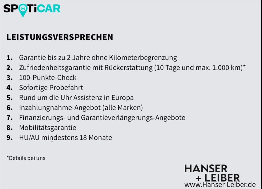 Sie erhalten von uns ein Jahr Garantie gemäß den Bedingungen SpotiCar/CAR Garantie. Günstige Finanzierungsmöglichkeiten -auch ohne Anzahlung- bis zu 96 Monate über unsere Hausbank jederzeit sehr gerne möglich. Ihren Gebrauchtwagen nehmen wir natürlich in Zahlung.
