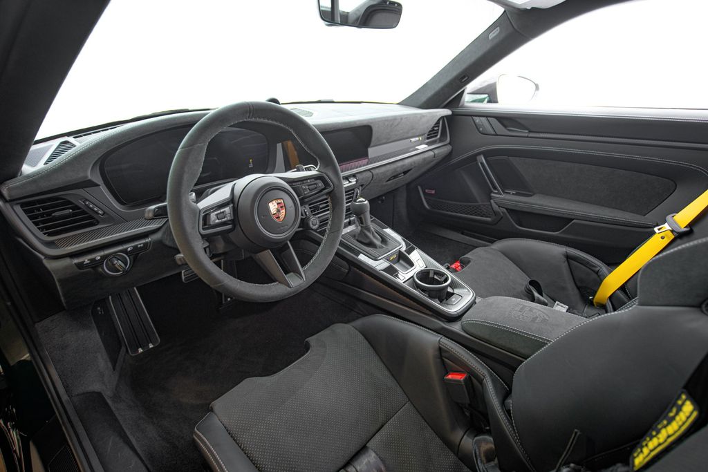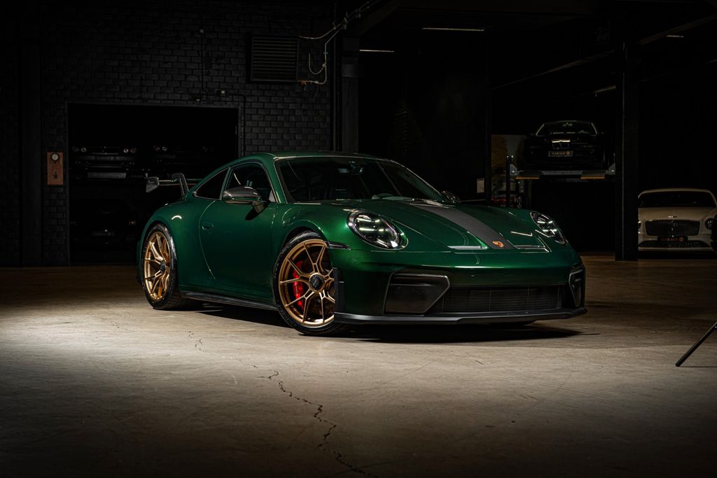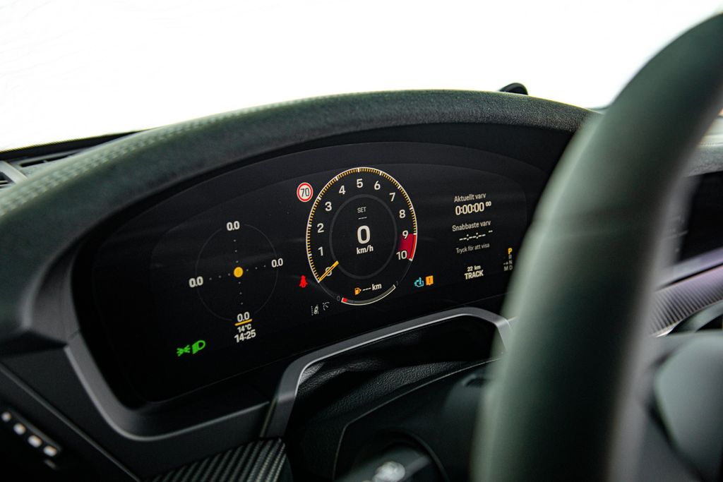 This brand new example is of course a Swedish-sold car where no savings have been made on the options with a final bill of over 60,000€ in options. Something that becomes crystal clear when you first approach this wonderful Oak Green Neo 992.2 GT3. The metallic green exterior is surgically divided into a carbon fiber stripe that runs across the entire car. The same material characterizes the inserts in the front and also the sides of the wing. These also proudly bear a "Weissach" emblem. The green exterior is also contrasted by rims painted in "California Gold". A classic and timeless whole. It is a car full of wonderful details. Like the PDLS lights and taillights in Exclusive Design.It is always with devotion that you open the door to a GT3. It is truly a car that in many ways has no equal in the automotive industry. Here you are greeted by an illuminated matte carbon fiber strip before finally landing in the now more foldable bucket seats. Alcantara and leather are interspersed with carbon fiber decor in this interior where everything seems to be here for a reason. Perfectly placed and balanced. The driver's environment is new here for the second generation of the 992 and now more fully digital with a screen in front of the driver. Unique to the GT3 model is the lack of a start button as the car still retains a knob for starting. And to turn the ignition in 2026 and hear a naturally aspirated engine revving a stiff 9000 rpm is a religious experience.