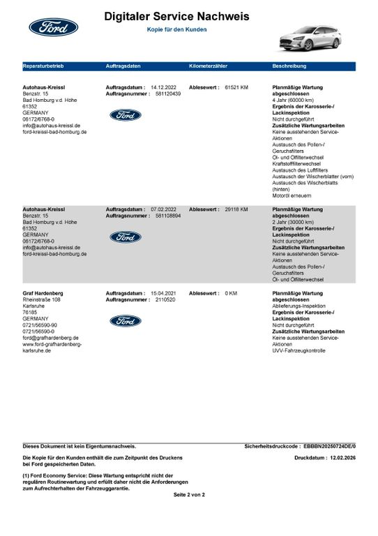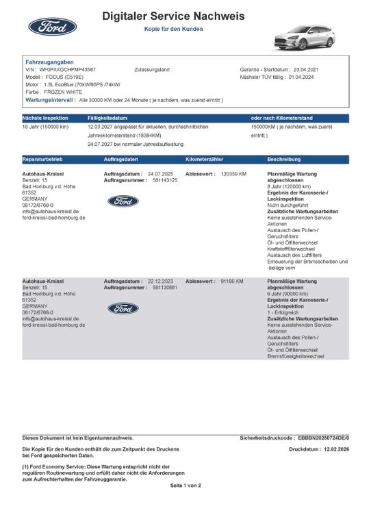 Letzter Ford Service in 07/2025 bei 120TKM durchgeführt