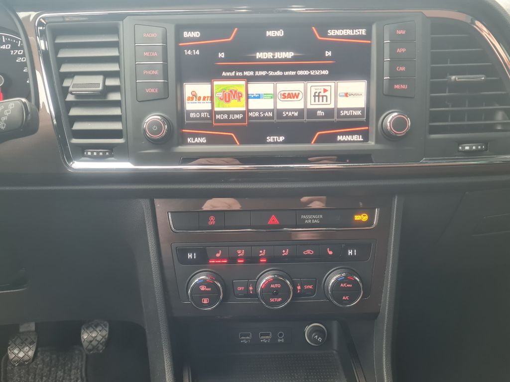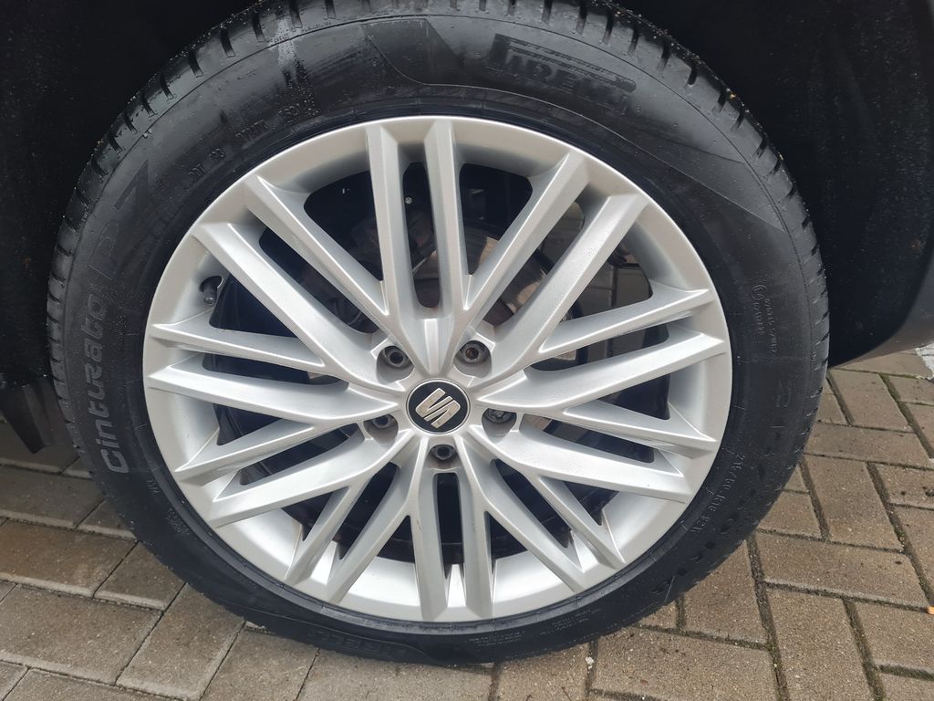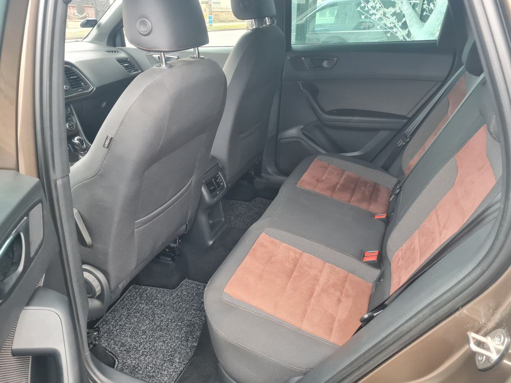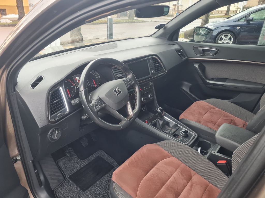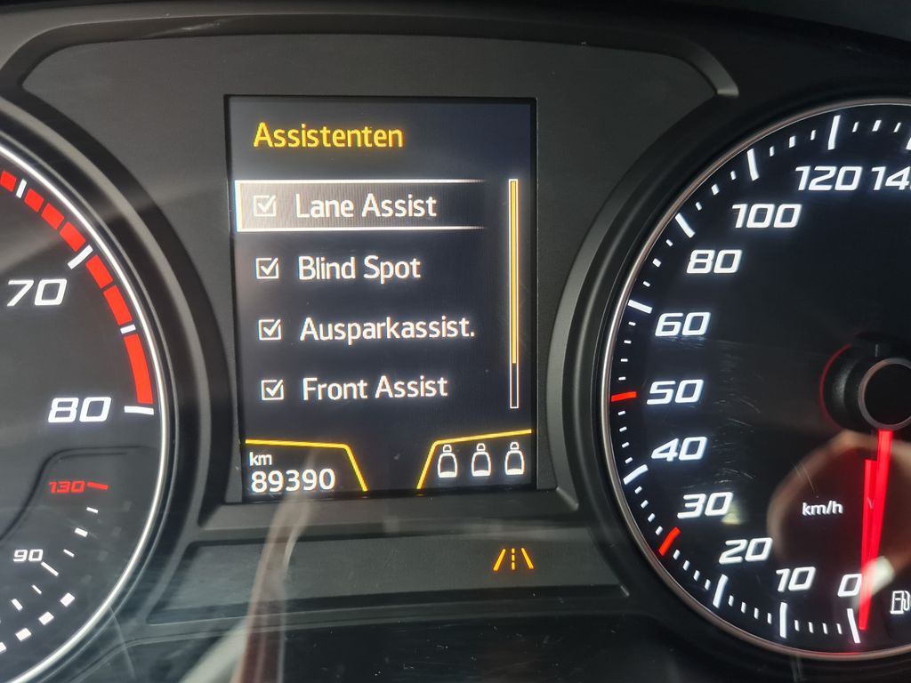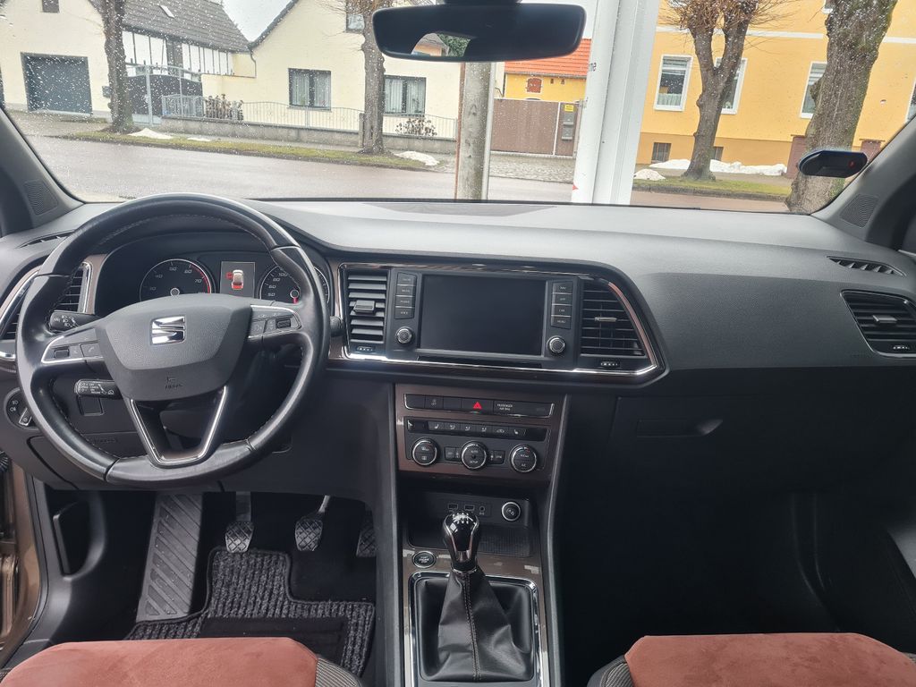 3. Bremsleuchte, Airbag Beifahrerseite abschaltbar, Airbag Fahrer-/Beifahrerseite, Antriebs-Schlupfregelung (ASR), AUX-IN-Anschluss und 2 x USB-Anschluss, Außenspiegel elektr. verstell-, heiz- und anklappbar mit Spiegelabsenkung und Welcome Light, Außenspiegel elektr. verstell-, heiz- und anklappbar, beide, Außenspiegel lackiert, Außenspiegel und Türgriffe außen in Wagenfarbe, Blinkleuchte in Außenspiegel integriert, Bordcomputer, Bremsassistent, Chrom-Paket, Dachhimmel schwarz, Doppeltonhorn, Einparkhilfe hinten, Fahrassistenz-System: Berganfahr-Assistent (Hill-Holder), Fahrassistenz-System: Fahrprofilauswahl (SEAT Drive Profile), Fahrassistenz-System: Müdigkeitserkennung, Fahrassistenz-System: Umfeldbeobachtungssystem (Front assist) mit City-Notbremsfunktion, Fensterheber elektrisch vorn + hinten, Fußraumbeleuchtung vorn, Gepäckraumabdeckung / Rollo, Handschuhfach beleuchtet, Heckleuchten LED, Innenausstattung: Chrom-Applikationen, Innenraumlicht-Paket LED, Isofix-Aufnahmen für Kindersitz, Karosserie: 5-türig, Klimaanlage Climatronic 2-Zonen, Knieairbag Fahrerseite, Komfortsitze, Kopf-Airbag-System, Kopfstützen hinten (3-fach), Kopfstützen vorn, Lendenwirbelstütze Sitz vorn links, verstellbar, Lendenwirbelstütze Sitz vorn rechts, verstellbar, Lendenwirbelstütze verstellbar, Lenkrad (Sport/Leder) mit Multifunktion, Licht- und Sicht-Paket, LM-Felgen, Mittelarmlehne hinten, Mittelkonsole vorn mit Mittelarmlehne, Becherhalter, Ablagebox und Luftdüsen hinten, Motor 1,4 Ltr. - 110 kW 16V TSI ACT, Parkbremse elektrisch, Radstand 2638 mm, Reifen-Reparaturset, Reifenkontroll-Anzeige, Rückfahrkamera, Rücksitzlehne klappbar, Rücksitzlehnen umklappbar mit Fernentriegelung im Kofferraum, Schadstoffarm nach Abgasnorm Euro 6, Schalt-/Wählhebelgriff Leder, Scheinwerfer LED, Schließ-/Startsystem Kessy, Seitenairbag, Seitenscheiben hinten und Heckscheibe abgedunkelt, Sitz vorn links höhenverstellbar, Sitz vorn rechts höhenverstellbar, Sitzbezug / Polsterung: Leder / Alcantara, Start/Stop-Anlage, Stau-/Ablagefach unter Sitz vorn links, Steckdose (12V-Anschluß) vorn, Verglasung getönt, Verzurrösen Koffer-/Laderaum, Wärmeschutzverglasung
