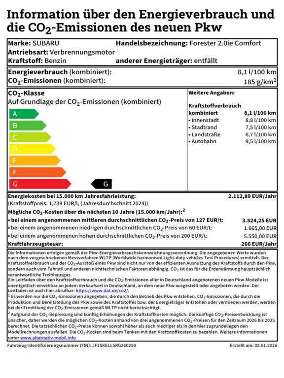 Airbag Fahrer-/Beifahrerseite, Airbag Fahrer-/Beifahrerseite und Seitenairbag vorn, Akustischer Fußgängerschutz (Außensound), Anhänger-Stabilisierungs-Programm, Armauflage vorn, Audiosystem: Radio mit CD-Player, Auspuffblende (Edelstahl), Regen-/Lichtsensor, Außenspiegel elektr. anklappbar, Außenspiegel elektr. verstellbar/heizbar, Außenspiegel mit Einparkfunktion/Rückwärtsparkhilfe, Außenspiegel mit Kamera, rechts, Außenspiegel silber, Außentemperaturanzeige, Blinkleuchten LED in Außenspiegel integriert, Bremsassistent, Dachantenne, Dachreling silber, ESP, Fahrassistenz-System: aktiver Spurhalteassistent, Antriebsmomentkontrolle, Müdigkeitserkennungs-Sensor, Bergab-/anfahrhilfe, EyeSight, Fahrer-Erkennung (Driver Monitoring System), Fernlichtassistent, Frontkollisionswarnung, Kollisionswarnsystem hinten, Notbrems-Assistent, Querverkehrs-Assistent, Sicherheitssystem mit automatischem Notruf (ERA GLONASS / eCall), Spurhalteassistent (Lane Assist), Spurwechselassistent, Totwinkel-Assistent, Fahrer-Informations-System (FIS) mit Farbdisplay, Farbdisplay (6,2 Zoll), elektr. Fensterheber, Gepäck-/Laderaumleuchte, Gepäckraumabdeckung / Rollo, Geschwindigkeits-Begrenzeranlage, Geschwindigkeits-Regelanlage (Tempomat) mit Abstandsregelung, Getränkehalter, Gurtstraffer, Heckklappenöffnung elektrisch, Heckleuchten LED, Heckscheibe heizbar, Heckspoiler schwarz lackiert, Infotainment-System: SUBARU STARLINK, Innenausstattung: Interieurleisten Schwarz, Innenspiegel mit Abblendautomatik, Isofix-Kindersitz-System, Kennzeichenbeleuchtung LED, Kindersicherung, Klimaautomatik 2-Zonen, Knieairbag Fahrerseite, Kopf-Airbag-System (Windowbag), Kopfstützen verstellbar, Kühlergrill schwarz, Kühlerjalousie, Aktiv, Lenkrad heizbar, Lenksäule (Lenkrad) höhenverstellbar, Lenksäule (Lenkrad) längsverstellbar, Leseleuchte, LM-Felgen, Luftdüsen hinten, Mittelarmlehne hinten, Mittelkonsole, Modellpflege, Motor 2,0 Ltr. - 110 kW Mild-Hybrid, Navigationssystem, Nebelscheinwerfer LED, Nebelschlussleuchte LED, Niveauregulierung, Notbrems-Warnblinkautomatik, Otto-Partikelfilter (GPF), Parkbremse elektronisch, Pedale Aluminium, Radstand 2670 mm, Reifen-Reparaturset, Reifendruck-Kontrollsystem, Rückfahrkamera, Rücksitzlehne geteilt / klappbar, Rücksitzlehne mit Fernentriegelung umklappbar, Rücksitzlehnen neigungsverstellbar, Schalt-/Wählhebelgriff Leder, Schaltfunktion (Schaltwippen/-tasten) am Lenkrad, Scheibenwaschanlage, Scheibenwaschanlage hinten, Scheibenwischerenteiser vorn, Scheinwerfer LED mit dynamischem Kurvenlicht, Seitenairbag vorn, SI-Drive, Sitz vorn links elektr. verstellbar (8-fach, mit Memory), Sitz vorn rechts elektr. verstellbar (8-fach), Polsterung: Stoff/Kunstleder, Sitzheizung hinten, Sitzheizung vorn, Sonderlackierung Ice-Silver-Metallic, Sonnenblenden mit Spiegel (beleuchtet), Sprachbediensystem Spracherkennung, Stabilitäts-Programm X-Mode, Start-Stop-Knopf, Start/Stop-Anlage, Steckdose (12V-Anschluß) im Handschuhfach, Steckdose (12V-Anschluß) im Koffer-/Laderaum, Steckdose (12V-Anschluß) in der Mittelkonsole, Stoßfänger Wagenfarbe, Tagfahrlicht LED, Türgriff außen Wagenfarbe, Türgriffe innen verchromt, Türverriegelung automatisch, USB-Anschlüsse (2) hinten, Verglasung getönt, Verglasung hinten abgedunkelt