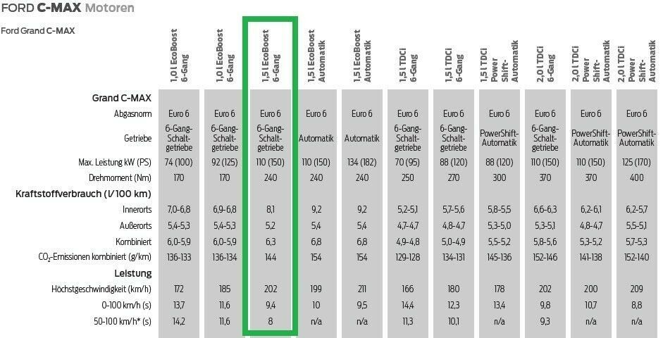 Motor: 1.5 Liter Ecoboost Benzin mit Euro 6d-Temp und grüner Plakette - siehe Auszug aus der Ford C-Max Produktbroschüre!