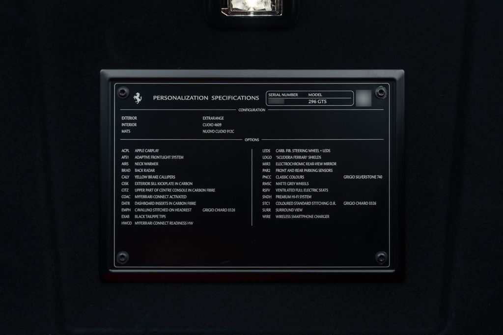 The Ferrari 296 GTS we are offering for sale has only 3,200 km on the odometer! This Ferrari boasts an elegant and sophisticated configuration. Painted in the elegant Grigio Silverstone color, with matte grey wheels, Scuderia shields, yellow brake calipers, and black exhaust tips, the interior of this Ferrari features Cuoio leather with a steering wheel in carbon fiber as well as many other parts, fully electric ventilated seats, and Grigio Chiaro stitching. This car is ideally equipped for everyday use, including parking assistance with a panoramic view, Apple CarPlay, adaptive headlights, and a premium sound system.