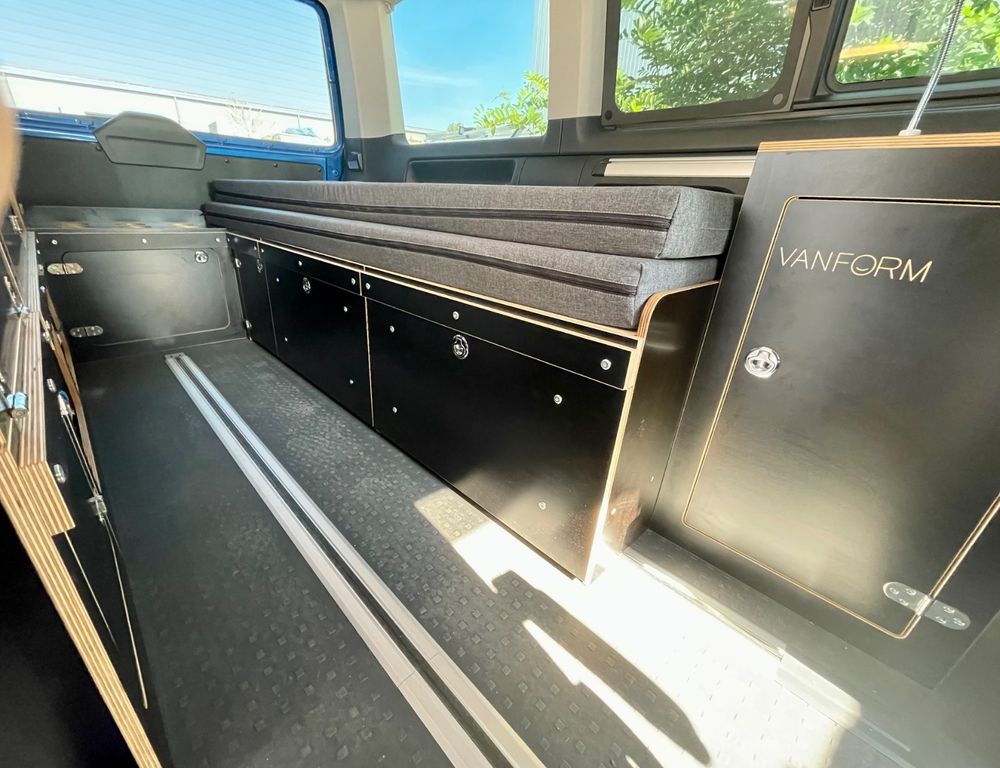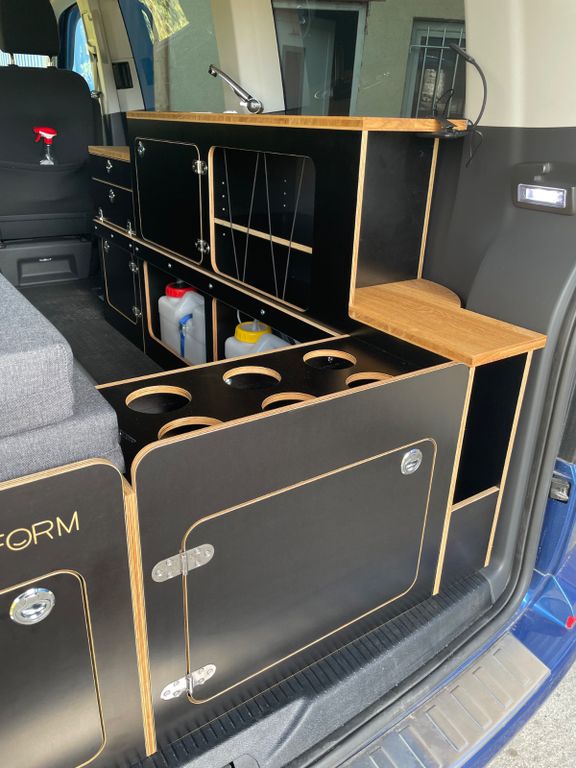 VW Multivan Trendline mit professionellen Ausbau zum Camper. Der komplette Ausbau ist ausschließlich auf dem Schienensystem befestigt. Durch diese Befestigung der einzelnen Module, ist der komplette Ausbau ohne jegliche Beschädigung am Auto de- und montierbar und es kann die originale 3er Sitzbank eingesetzt werden. Einzelsitze gehören nicht zum KFZ.Ausbau mit 10 Liter Frischwassertank und Pumpe + 10 Liter Abwassertank, Doppel-USB in der Arbeitsplatte, Küchenblock von 2 Seiten zugänglich und bei Bedarf separat heraus genommen und auf eine Ausrichtplatte mit Stellfüße gestellt werden, 2 große Vollauszüge unter der Sitzfläche, Beifahrersitz mit Drehkonsole, Dometic- Kompressorkühlbox, Gaskocher, mittlerer Schrank im Heck mit Durchladefunktion, große Schublade im Heck