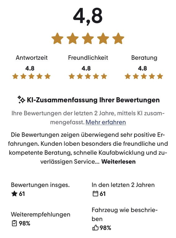 Bewertungen:Wir freuen uns über Ihr Feedback auf Google! Hinterlassen Sie gerne eine Bewertung in unserem Profil.https://g.page/r/CR01qxftOidDEBM/reviewIhr 1Car Team