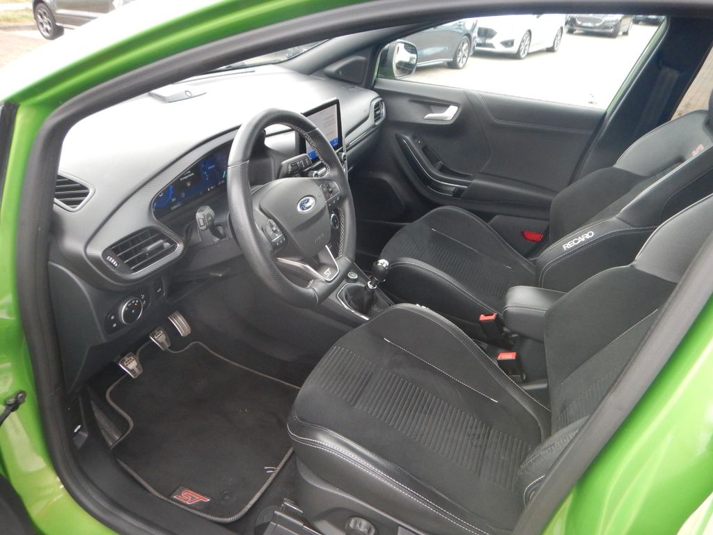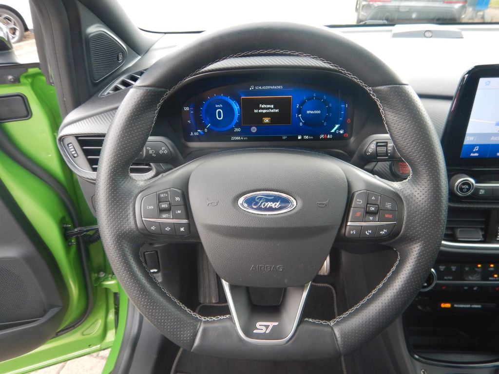 Ambiente-Beleuchtung vorn (LED), Antischlupfregelung (ASR), Audio-Navigationssystem Ford mit AppLink, Außenspiegel elektr. anklappbar, Außenspiegel elektr. verstell- und heizbar, Bi-LED-Scheinwerfer, Body-Styling-Paket, Bremssättel Rot lackiert, Dach andersfarbig lackiert / Kontrastfarbe, Dachhimmel Stoff, dunkel, Dachspoiler (große Ausführung) schwarz lackiert, Doppelendrohr Auspuffanlage, Eco-Anzeige für verbrauchsoptimiertes Fahren (EcoCoach), Einparkhilfe hinten, Fahrassistenz-System: Berganfahr-Assistent (Hill-Holder), Fahrassistenz-System: Falschfahrer-Warnfunktion, Fahrassistenz-System: Fernlichtassistent (Scheinwerfer mit Abblendautomatik), Fahrassistenz-System: Notbrems-Assistent, Fahrassistenz-System: Post-Collision-System, Fahrassistenz-System: Pre-Collision-System, Fahrassistenz-System: Spurhalteassistent mit Müdigkeitserkennungs-Sensor, Fahrassistenz-System: Verkehrsschildassistent, Farbdisplay für Bordcomputer, Fensterheber elektrisch vorn + hinten mit Komfortschließung, FordPass Connect inkl. eCall, Fußmatten ST-Design, Heckleuchten LED, Induktionsladeschale für mobile Endgeräte, Innenraumfilter: Staub- und Pollenfilter, Innenspiegel mit Abblendautomatik, Intelligent Protection System (IPS), Intelligenter Geschwindigkeits-Begrenzer, Isofix-Aufnahmen für Kindersitz, Karosserie: 5-türig, Klimaautomatik 2-Zonen, Kombiinstrument Digitalanzeige 12,3 Zoll, Kopfstützen hinten mechan. verstellbar (3 Stück), Lackierung Race-Rot, Laderaumboden variabel (Ford Megabox), Lendenwirbelstütze vorn, Lenkrad (Sport/Leder, ST), Lenkrad heizbar, Lenksäule (Lenkrad) höhen-/längsverstellbar, LM-Felgen, Motor 1,5 Ltr. - 147 kW EcoBoost KAT, My Key (2. Fahrzeugschlüssel programmierbar), Nebelscheinwerfer LED, Otto-Partikelfilter (OPF), Parkpilotsystem vorn, Pedale Aluminium, Radstand 2588 mm, Reifen-Reparaturkit, Reifendruck-Kontrollsystem, Rücksitzlehne geteilt/klappbar (60:40), Schadstoffarm nach Abgasnorm Euro 6d, Scheinwerfer-Assistent mit Tag-/Nachtsensor, Sitze vorn höhenverstellbar, Sitzheizung vorn, Sonnenblende links mit Spiegel (beleuchtet), Sonnenblende rechts mit Spiegel (beleuchtet), Sport-Fahrwerk, Sportsitze vorn (Recaro) Teilleder Dinamica, Standard Variante, Start/Stop-Anlage, Türgriffe außen Wagenfarbe, Verglasung hinten abgedunkelt (Privacy Glass)