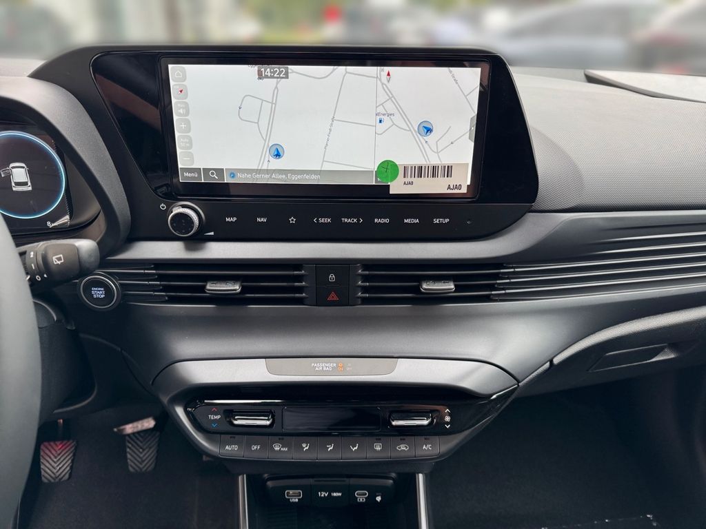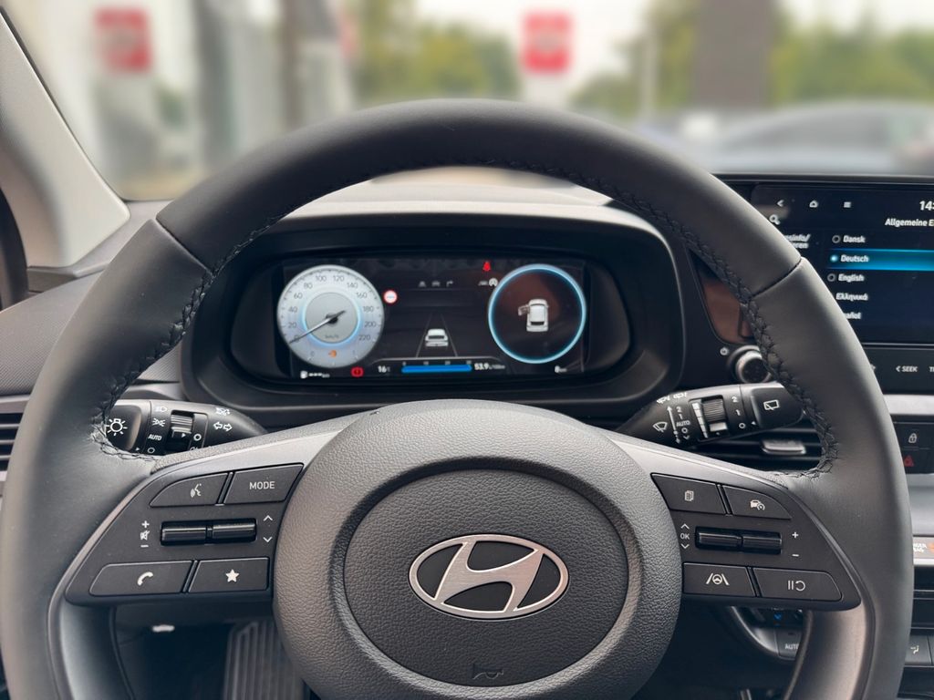 Airbag Beifahrerseite, Airbag Beifahrerseite abschaltbar, Airbag Fahrerseite, Ambiente-Beleuchtung, Audio-Navigationssystem, Audiosystem: Radio RDS, Außenspiegel elektr. anklappbar, Außenspiegel elektr. verstell- und heizbar, beide, Außenspiegel lackiert, Blinkleuchte in Außenspiegel integriert, Bordcomputer, Dachspoiler, Dachspoiler Wagenfarbe, Einschaltautomatik für Fahrlicht / Lichtsensor, Elektron. Stabilitätskontrolle (ESC) mit Bremsassistent, Fahrassistenz-System: aktiver Spurhalteassistent (LKAS, Lane Keep Assist System), Fahrassistenz-System: Aufmerksamkeits-Assistent, Fahrassistenz-System: Autonome Notbremsfunktion inkl. Frontkollisionswarnung (FCA), Fahrassistenz-System: Berganfahrhilfe, Fahrassistenz-System: Fahrprofilauswahl (Drive Mode), Fahrassistenz-System: Fernlichtassistent, Fahrassistenz-System: Insassenalarm (ROA), Fahrassistenz-System: Multikollisionsbremse (Multi Collision Brake), Fahrassistenz-System: Querverkehrs-Assistent Heck (Cross Traffic), Fahrassistenz-System: Sicherheitssystem mit automatischem Notruf (ERA GLONASS / eCall), Fahrassistenz-System: Totwinkel-Assistent, Fahrassistenz-System: Verkehrszeichenerkennung, erweitert (Geschwindigkeits-Regel-/Begrenzeranlage), Fensterheber elektrisch hinten, Fensterzierleisten verchromt, Freisprecheinrichtung Bluetooth, Funktions-Paket, Gepäck-/Laderaumleuchte, Gepäckraumabdeckung / Rollo, Gurtstraffer, Heckscheibe heizbar, Induktionsladeschale für Smartphone, Innenspiegel mit Abblendautomatik, Karosserie: 5-türig, Komfort-Paket, Kopf-Airbag-System, Kopfstützen hinten verstellbar, Kühlergrill schwarz (glanzlackiert), Lenkrad heizbar, Lenksäule (Lenkrad) höhenverstellbar, Lenksäule (Lenkrad) längsverstellbar, Licht-Paket, LM-Felgen, Modellpflege, Motor 1,0 Ltr. - 74 kW TGDI KAT, Otto-Partikelfilter (OPF), Radioempfang digital (DAB+), Reifen-Reparaturkit, Reifendruck-Kontrollsystem, Rückfahrkamera, Rücksitzlehne geteilt/klappbar, Schadstoffarm nach Abgasnorm Euro 6e, Seitenairbag vorn, Service-System: Remote Services (Blue Link), Sicherheitsgurte vorn höhenverstellbar, Sitz vorn links höhenverstellbar, Sitzbezug / Polsterung: Stoff, Sitzheizung vorn, Smart-Paket, Sonnenblenden mit Spiegel (beleuchtet), Sound-System BOSE, Start/Stop-Anlage, Steckdose (12V-Anschluß) vorn, Türgriffe außen Wagenfarbe, USB-Anschluss (Typ C), USB-Anschluss hinten, USB-Anschluss hinten (Typ C), USB-Anschluss Mittelkonsole, Verglasung getönt, Verglasung hinten abgedunkelt (Privacy Glass), Warnanlage für Sicherheitsgurte, Fahrer-/Beifahrerseite, Wireless SmartLink (Apple CarPlay)