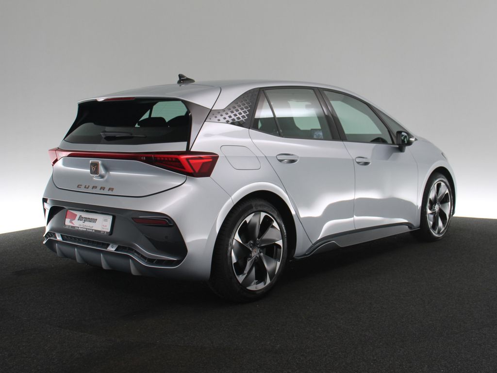 Scheinwerfer Voll-LED, Abbiege- und Allwetterlicht, Fahrassistenz-System: Spurhalteassistent, Frontkamera, Außenspiegel elektr. verstell-, heiz- und anklappbar mit Spiegelabsenkung und Welcome Light, Blinkleuchten LED in Außenspiegel integriert, Heckleuchten Voll-LED mit Lichtband (Infinite Light), Licht- und Regensensor, Schriftzug auf der Heckklappe, Heckspoiler Wagenfarbe (Dachspoiler), Wärmeschutzverglasung, 5 Lautsprecher, Notrufsystem, USB-Ladeanschlüsse (2-fach, Typ C) für 2.Sitzreihe, Bluetooth-Schnittstelle mit Freisprecheinrichtung integriert, Kombiinstrument digital (virtual cockpit), Einparkhilfe vorn und hinten, Reifenkontroll-Anzeige, Pedale Aluminium-Design, Airbag Fahrer-/Beifahrerseite, Seitenairbag vorn mitte (Central Airbag), Kopf-Airbag-System, Seitenairbag, Airbag Beifahrerseite abschaltbar, Mittelarmlehne vorn, Dachhimmel schwarz, Klimaanlage Climatronic 2-Zonen, Sitzbezug / Polsterung: Stoff, Sport-Schalensitze vorn mit integrierten Kopfstützen, Sitz vorn links höhenverstellbar, Rücksitzlehne geteilt/klappbar (1/3-2/3), Fensterheber elektrisch vorn + hinten mit Komfortschaltung, Warnanlage für Sicherheitsgurt-System, Ambiente-Beleuchtung LED, Fußraumbeleuchtung LED, Innenspiegel mit Abblendautomatik, Sonnenblende links mit Spiegel (beleuchtet), Sonnenblende rechts mit Spiegel (beleuchtet), Wegfahrsperre (elektronisch), Akustischer Fußgängerschutz, Außensound (e-sound / AVAS), Isofix-Aufnahmen für Kindersitz an Beifahrersitz und Rücksitz (inkl. i-Size-Kindersitze), Anti-Blockier-System (ABS), Parkbremse elektrisch, Fahrassistenz-System: Umfeldbeobachtungssystem (Front assist) mit City-Notbremsfunktion, Fahrassistenz-System: Müdigkeitserkennung, Lenkrad heizbar (CUPRA Supersport, Leder) mit Multifunktion und Schaltfunktion, Progressivlenkung, Servolenkung elektro-mechanisch, Elektron. Stabilitätskontrolle (ESC), Antriebs-Schlupfregelung (ASR), Fahrassistenz-System: Fahrprofilauswahl (CUPRA Drive Profile), HV-Batterie 82 kWh brutto / 77 kWh netto, Schnellladevorrichtung (CCS-Ladedose), Ladekabel mit Typ 2-Stecker (Mode 3), Karosserie: 5-türig, Getriebe für Elektrofahrzeug, Elektromotor 170 kW (cont. 70 kW).
