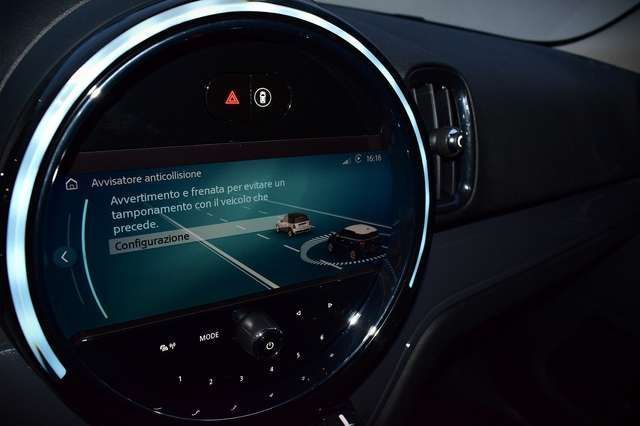 Autovettura dotata dei seguenti optional:vernice metallizzata Enigmatic Black,tetto/specchietti in tinta carrozzeria,climatizzatore manuale,sedili in stoffa Firework Carbon Black,superfici interne in Hazy Grey,volante sportivo in pelle con comandi multifunzione regolabile in altezza e profondità,bracciolo centrale anteriore,MINI Connected,interfaccia Bluetooth,Radio MINI Visual Boost da 8,8",Radio DAB,Keyless GO (avviamento vettura senza chiave),Driving Assistant con Lane Departure Warning,Cruise Control,sensore luci/pioggia,cambio automatico Steptronic a 7 rapporti,retrovisori regolabili elettricamente,fari a Led con funzione Cornering,sedili posteriori scorrevoli con funzione “Cargo”,sedili posteriori abbattibili e frazionabili 40:20:40,barre al tetto e listelli laterali color alluminio,sensori di parcheggio posteriori (PDC),indicatore pressione pneumatici,cerchi in lega da 16" Channel Spoke neri,fari fendinebbia a Led.