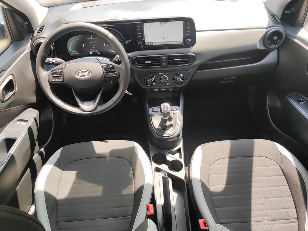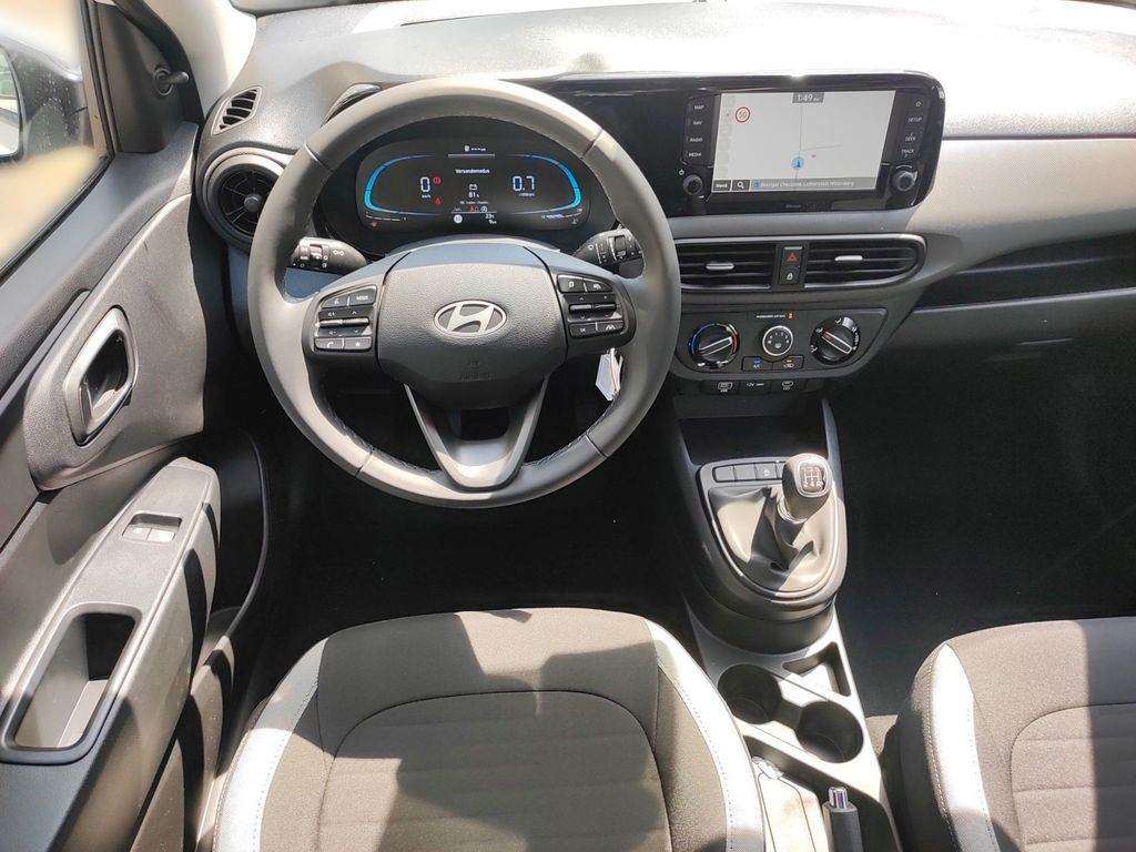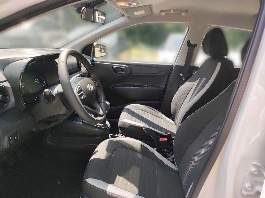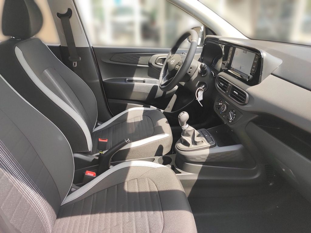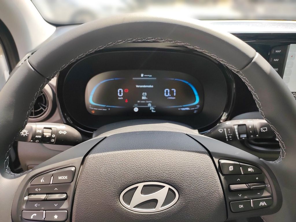 Der neue Hyundai i10 präsentiert sich als moderner Kleinwagen mit umfangreicher Ausstattung für den deutschen Markt. Mit seinem 998 ccm Motor und 63 PS bietet er agile Fahrleistungen bei gleichzeitig niedrigem Verbrauch. Der Frontantrieb und die manuelle Schaltung sorgen für ein direktes Fahrgefühl. Die weiße Außenlackierung verleiht dem Fahrzeug eine frische Optik, während der schwarze Stoffinnenraum praktisch und ansprechend gestaltet ist.Die Sicherheitsausstattung umfasst zahlreiche moderne Assistenzsysteme wie Kollisionsvermeidung, Spurhalteassistent, Müdigkeitserkennung und Verkehrszeichenerkennung. Für Komfort sorgen die manuelle Klimaanlage, elektrische Fensterheber, Zentralverriegelung und ein Multifunktionslenkrad mit Lederbezug. Das digitale Cockpit mit Touchscreen, Navigationssystem, Apple CarPlay und Android Auto bietet zeitgemäße Konnektivität.